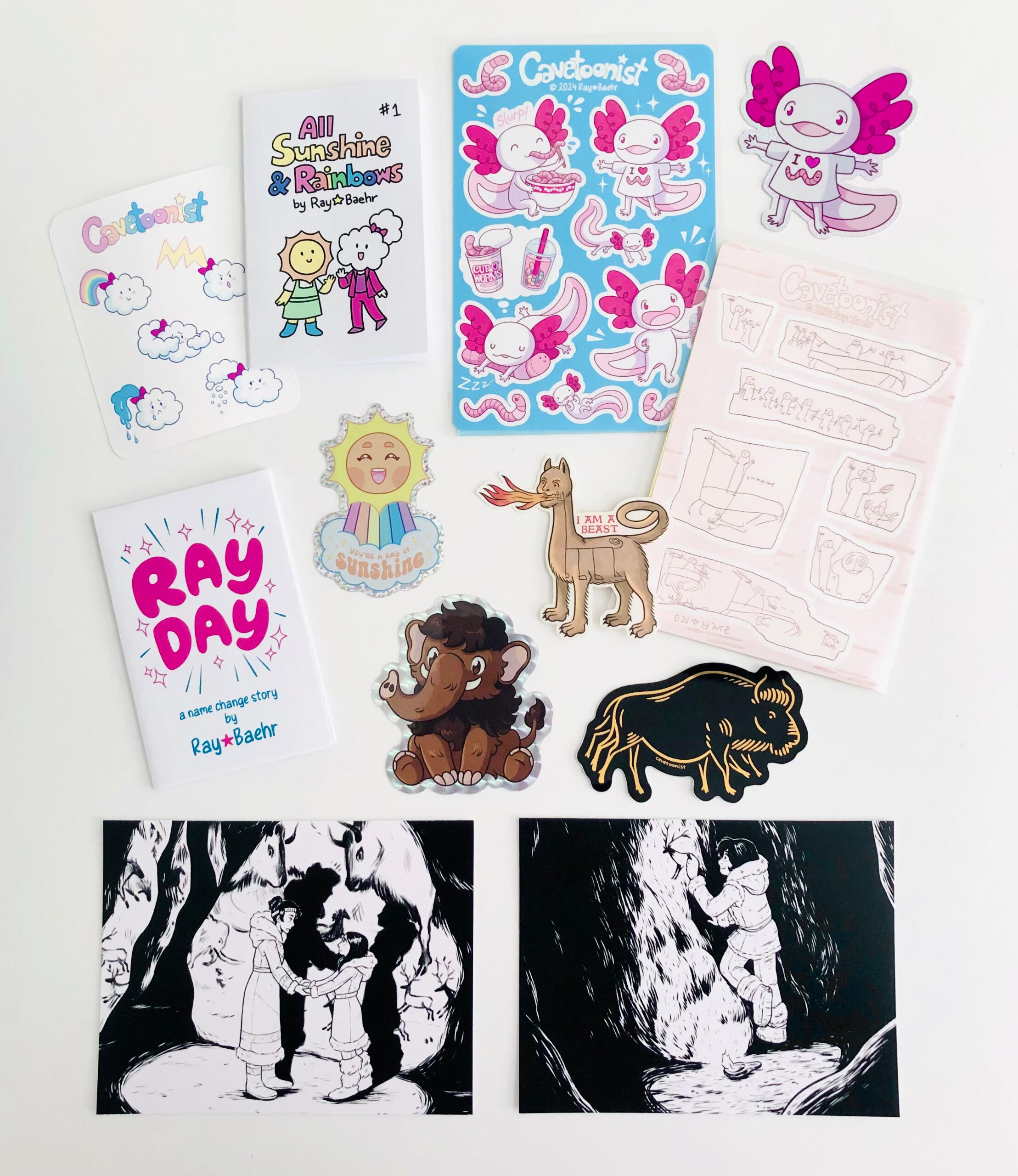 Current members: Please check your email for more info!~~~Sign-up for my snail mail club to automatically receive new printed goodies such as mini prints, stickers, zines, and mini comics made by me every month! Themes or topics may include prehistory, art history, outer space, LGBTQIA+, and cute characters!The photo below showcases the goodies I sent out to club members in 2024 to give you an idea of what to expect. I don't share previews of goodies ahead of time. They are meant to be a surprise when you open your Ray Mail!